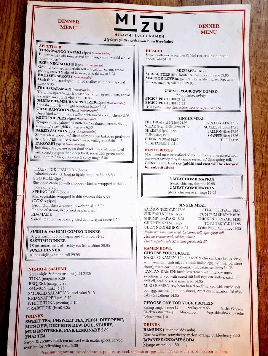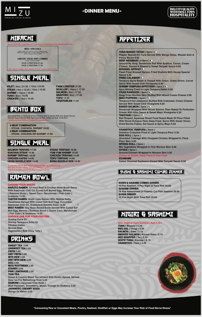 Welcome to Mizu Hibachi Sushi & Ramen, a culinary gem located in Kirksville, MO. Here, the menu showcases an enticing fusion of traditional Japanese flavors, bringing together expertly crafted sushi and rich, comforting ramen.